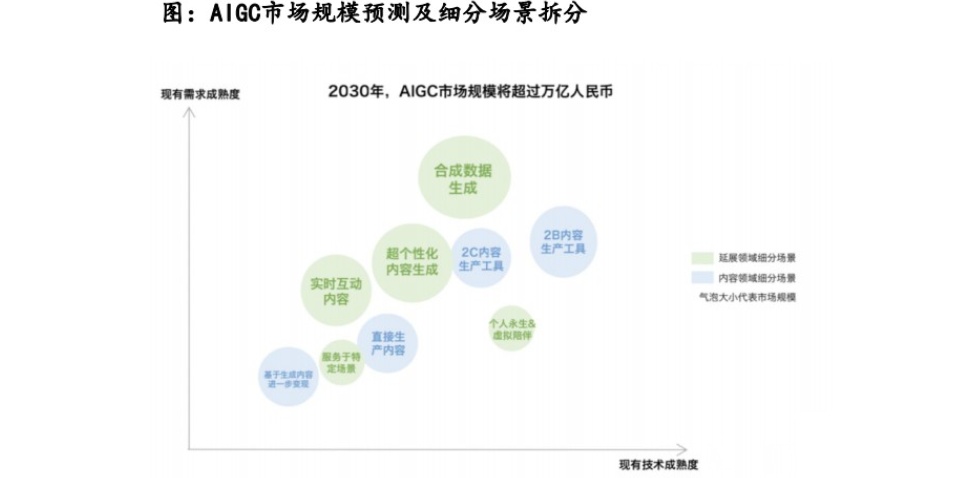据Gartner《2021年预测:人工智能对人类和社会的影响》,到2025年AIGC产生的数据将占所有数据的10%,而该比例在2021年不足1%。而量子位智库根据现有技术及需求成熟度预测,2030年AIGC市场规模将超过万亿人民币。