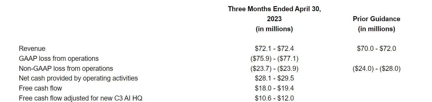 值得注意的是,C3.ai 在5月15日公布了截至4月30日的第四财季初步业绩,该公司预计营收在7210万美元至7240万美元之间,超过了华尔街预期和该公司的指引。C3.ai还预计,经营活动产生的净现金为2810万美元至2950万美元,自由现金流为1800万美元至1940万美元,调整后运营损失在2370万美元至2390万美元之间,高于指引。