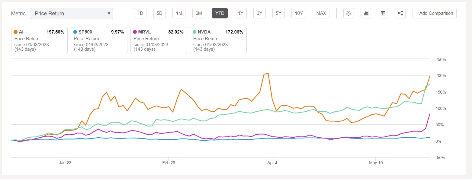 近日,AI芯片领域的领军者英伟达(NVDA.US)与迈威尔科技(MRVL.US)先后公布的超预期财报和无与伦比的强劲业绩预期,推动围绕AI的投资热潮不断升温,进而推高纳斯达克100指数以及美股大盘标普500指数。受益于AI热潮的C3.ai年内涨幅接近200%,超过英伟达。因此,投资者们也期待这家“非常纯粹的”人工智能软件公司C3.ai的强劲业绩,以及管理层在业绩会议上能够释放出关于AI行业发展的乐观信号。