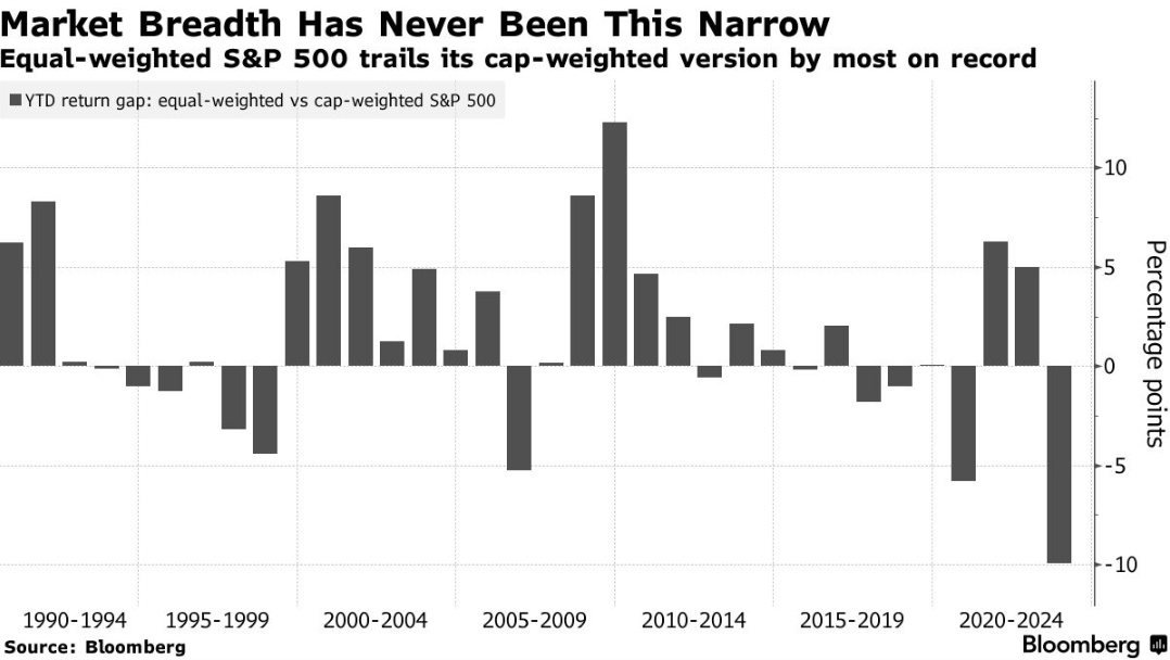 值得一提的是,在标普500指数和纳斯达克100指数等指数中,从来没有这么少的股票承担如此大的负担,尤其是还有数万亿美元的被动投资依赖于这些指数。