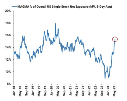 对于其他所有人——从被动买入持有到对冲基金——来说,“七大股票”的持续增长要么无关紧要,要么是通往相对富裕的途径。高盛机构经纪公司编制的数据显示,对冲基金已将其持有的股票占其整体单股净敞口的比例从今年年初的9.7%提高至16%。