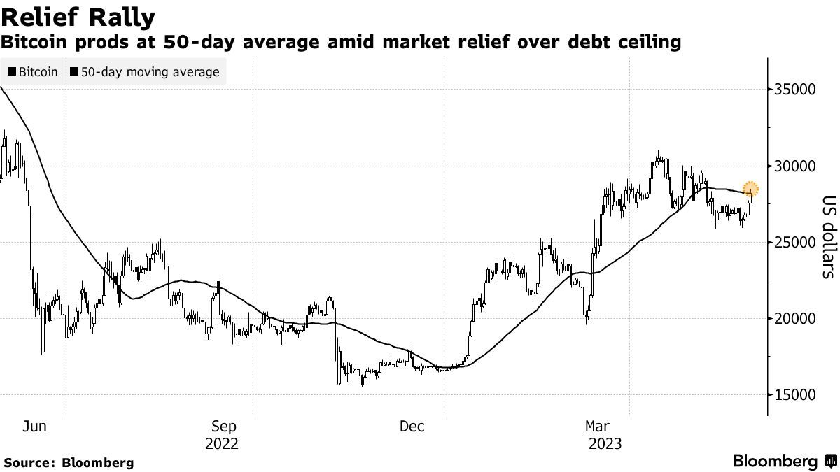 缓解性反弹——比特币触及50日平均线,市场对债务上限协议感到宽慰