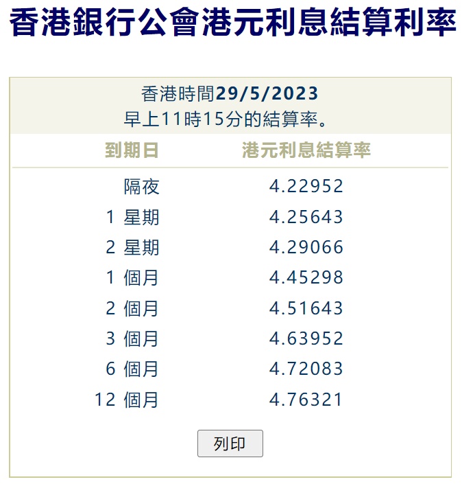 智通财经APP获悉看,5月29日,港元拆息全线向上,与楼按相关的一个月拆息报4.45298厘,升6.435基点,连升两日;隔夜息亦升73.714基点至4.22952厘。反映银行资金成本的三个月拆息报4.63952厘,升0.75基点;六个月及一年期拆息分别升1.369基点及4.642基点,至4.72083厘及4.76321厘。