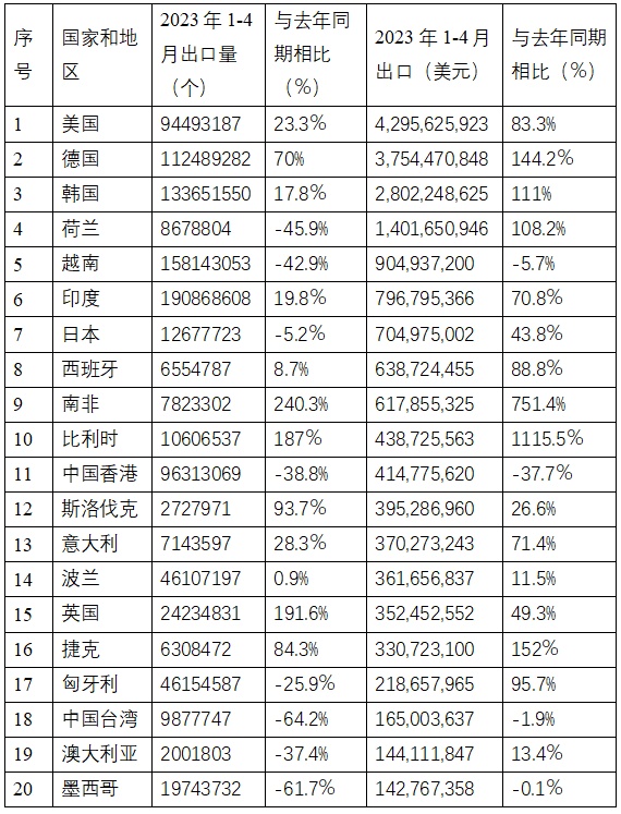 2023年1-4月锂离子电池出口前二十大目的地变化情况