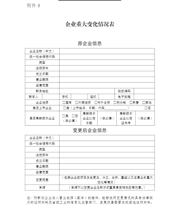 六、清单有效期内,如企业发生更名、分立、合并、重组以及主营业务重大变化等情况,应于完成变更登记之日起45日内向省级工业和信息化部门报告,省级工业和信息化主管部门于企业完成变更登记之日起 60 日内,将核实后的企业重大变化情况表 (附件 3)和相关材料报送工业和信息化部,工业和信息化部、国家发展改革委会同相关部门确定发生变更情形后是否继续符合享受优惠政策的企业条件。企业超过本条前述时间报送变更情况说明的,地方工业和信息化部门不予受理,该企业自变更登记之日起停止享受 2023 年度相关政策。