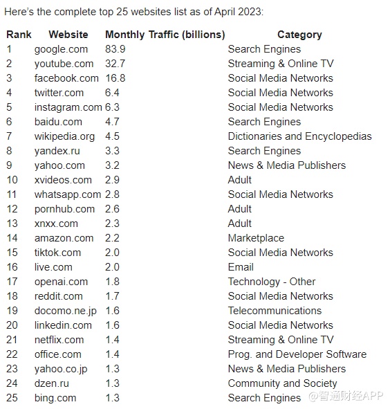 以下是截至2023年4月的前25大流量网站榜单: