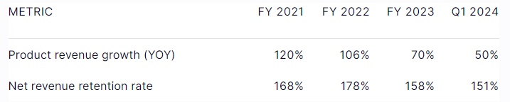 空头认为,尽管Snowflake最初像野草一样成长,但其产品收入的增长(占其第一季度收入的95%)自IPO以来已经放缓。该公司的净收入留存率也一直在下降。净收入留存率衡量的是每位现有客户的收入同比增长率。