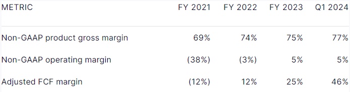 Snowflake预计全年的非GAAP产品毛利率将达到76%,非GAAP营业利润率为5%,调整后的FCF利润率为26%。利润率的上升可以完全归功于其规模的扩大,而不是积极的成本削减措施。