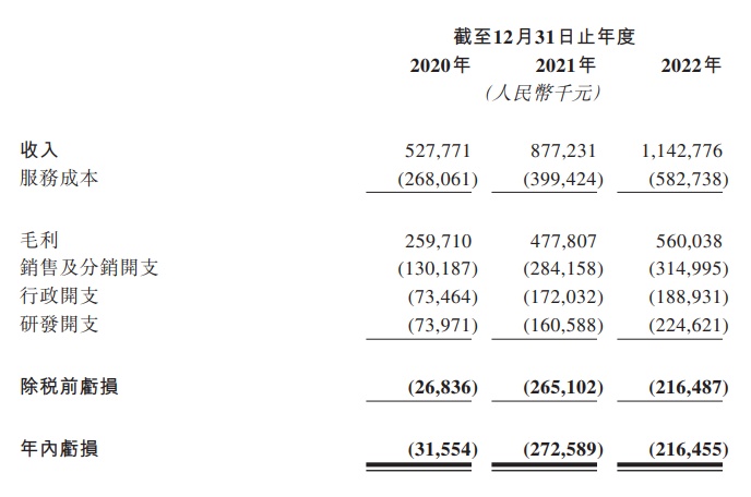 财务方面,于2020年、2021年及2022年,该公司分别实现收入约5.28亿元(人民币,下同)、8.77亿元及11.43亿元;同期,年内亏损分别约为3155.4万元、2.73亿元及2.16亿元。