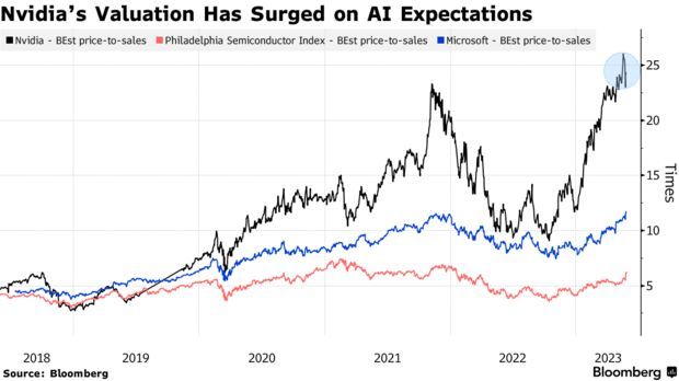 数据显示,在人工智能热潮引发投资者热情之际,英伟达的预期市销率高达25倍,相比之下,费城半导体指数成分股公司的预期市销率仅仅约为6倍,为OpenAI提供支持的微软(MSFT.US)的预期市销率约为12倍。