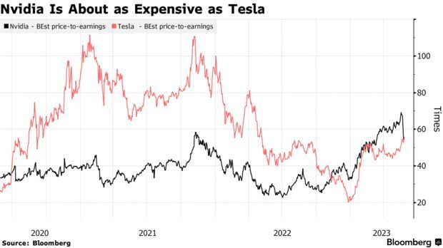 此外,伍德还表示,特斯拉是AI发展的“最明显受益者”。英伟达最新的业绩指引推高了华尔街对其盈利的预期,其预期市盈率已从近70倍降至55倍左右,与特斯拉股票的溢价程度相近。