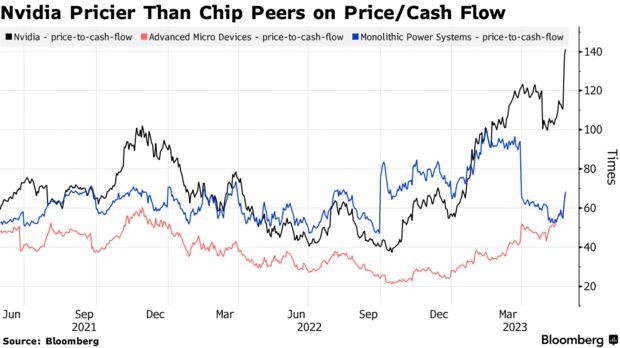 以公司实际产生的现金量来衡量,英伟达是迄今为止费城半导体指数(SOX)同类公司中估值最高的。该公司目前的市值是现金流的140倍以上,是其同行AMD(AMD.US)和Monolithic Power Systems(MPWR.US)的两倍多。