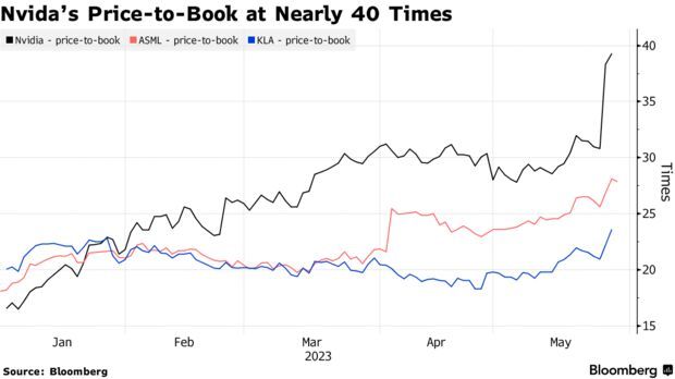 相对于公司资产价值,英伟达的股价也出现了明显的跃升。英伟达目前的市净率接近40倍,而阿斯麦(ASML.US)和科磊(KLAC.US)的市净率不到30倍。