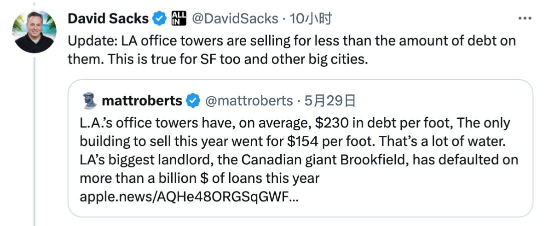 据了解,PayPal前首席运营官David Sacks周一转发了一条有关洛杉矶商业地产危机的推文,该推文写道:“洛杉矶的办公大楼平均每英尺负债230美元,今年唯一售出的大楼以每英尺154美元的价格出售。亏了很多钱。洛杉矶最大的房东,加拿大巨头布鲁克菲尔德今年已拖欠了超过10亿美元的贷款。”