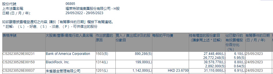 智通财经APP获悉,香港联交所最新资料显示,5月24日,朱雀基金减持福莱特玻璃(06865)114.2万股,每股作价23.67港元,总金额约为2703.11万港元。减持后最新持股数目为3111万股,最新持股比例为6.91%。