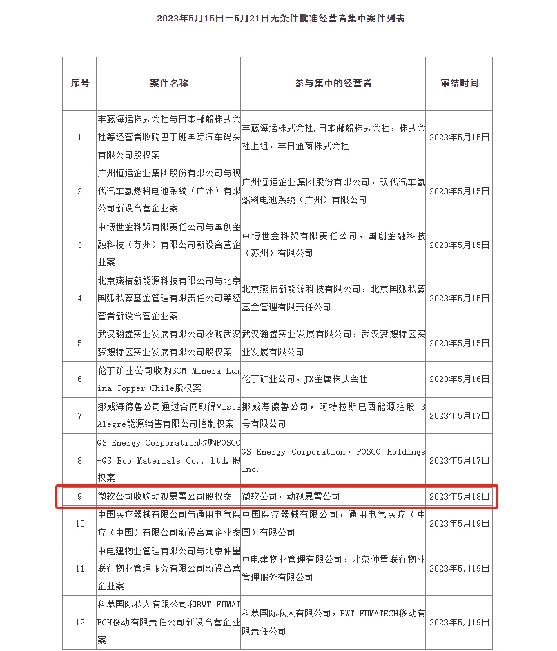 智通财经APP获悉,5月30日,国家市场监管总局竞争政策协调司公布5月15日-5月21日无条件批准经营者集中案件列表,批准微软公司(MSFT.US)收购动视暴雪公司(ATVI.US)股权案,审结时间为5月18日。