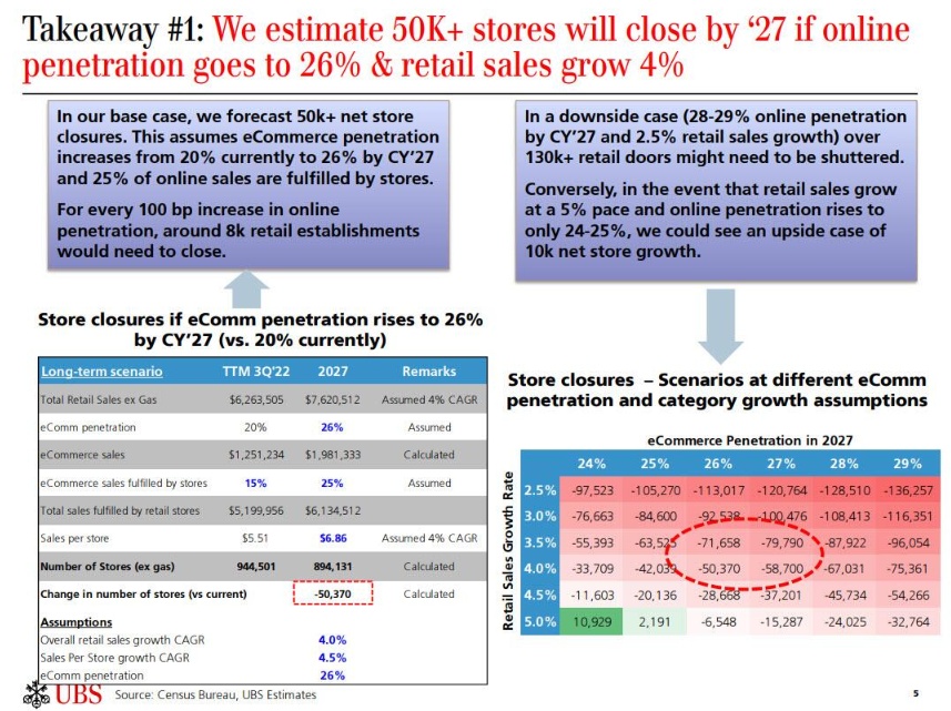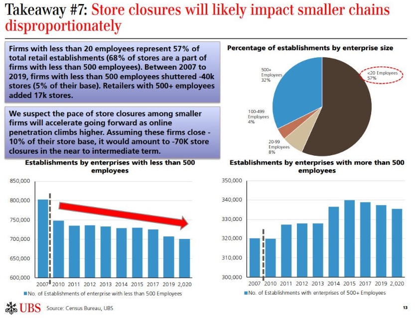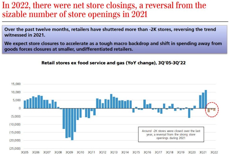 瑞银强调了导致零售商店关闭的几个因素,包括:更高的成本,这提高了维持门店营业的门槛;大多数零售行业的同店销量下降;而且,门店关闭可能会不成比例地影响较小的连锁店。