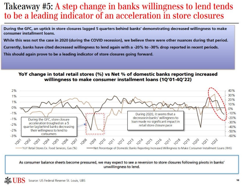 此外,银行放贷意愿的变化往往是门店倒闭加速的先行指标,在美国金融环境收紧的情况下,美国银行业正在艰难应对存款流失的问题,因此,美国银行业也正在收紧贷款条件,更难以获得的资金提高了成本,而更高的成本提高了开店的门槛。