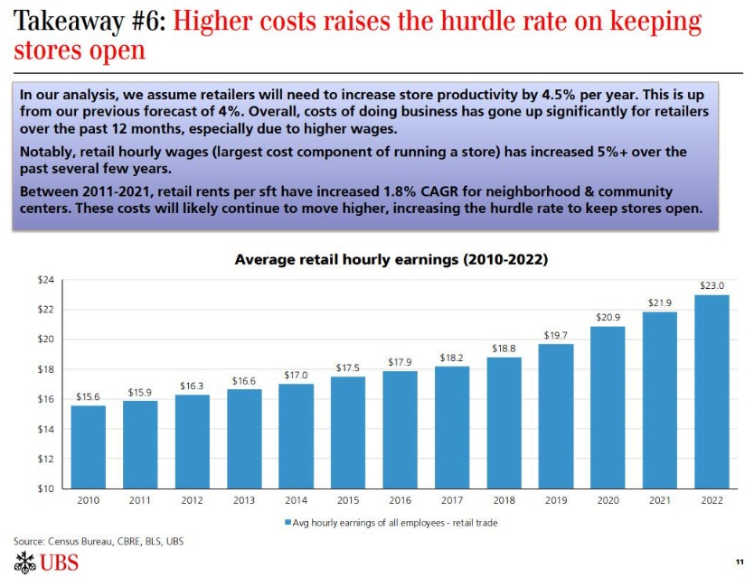 除此之外,由于社区每平方英尺的零售租金增加,零售商将需要每年提高4.5%的店铺生产力。瑞银表示:“这些成本可能会继续上升,提高维持门店营业的最低门槛。”