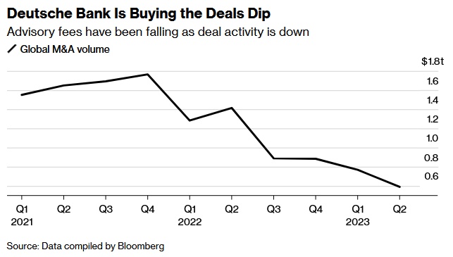 现在最大的问题是,并购交易活动将以多快的速度开始反弹。今年以来,全球并购交易量下降了约46%,而且几乎没有迹象表明这一趋势会很快逆转。此外,德银在并购业务方面的起点也很低,自2017年以来,该行一直未能跻身全球十大交易撮合者之列。