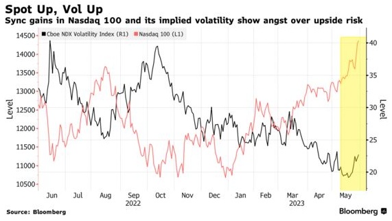 当股票上涨时,预期波动率通常会下降,因为投资者倾向于使用期权来对冲下跌。这就是纳斯达克 100 指数和 Cboe NDX 波动率指数通常走势相反的原因。现在,由于担心错过下一次大反弹,两者的走势正以罕见的速度同步。