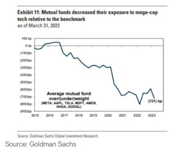 收复失地的压力不小。高盛编制的数据显示,第一季度平均共同基金将其在七大巨头(包括苹果、微软(MSFT.US)、Alphabet(GOOGL.US)、亚马逊(AMZN.US)、Meta(META.US)、英伟达(NVDA.US)和特斯拉(TSLA.US))中的风险敞口削减了 130 个基点。因此,根据分析,他们的减持态势使 2023 年相对于市场的表现减少了 189 个基点。