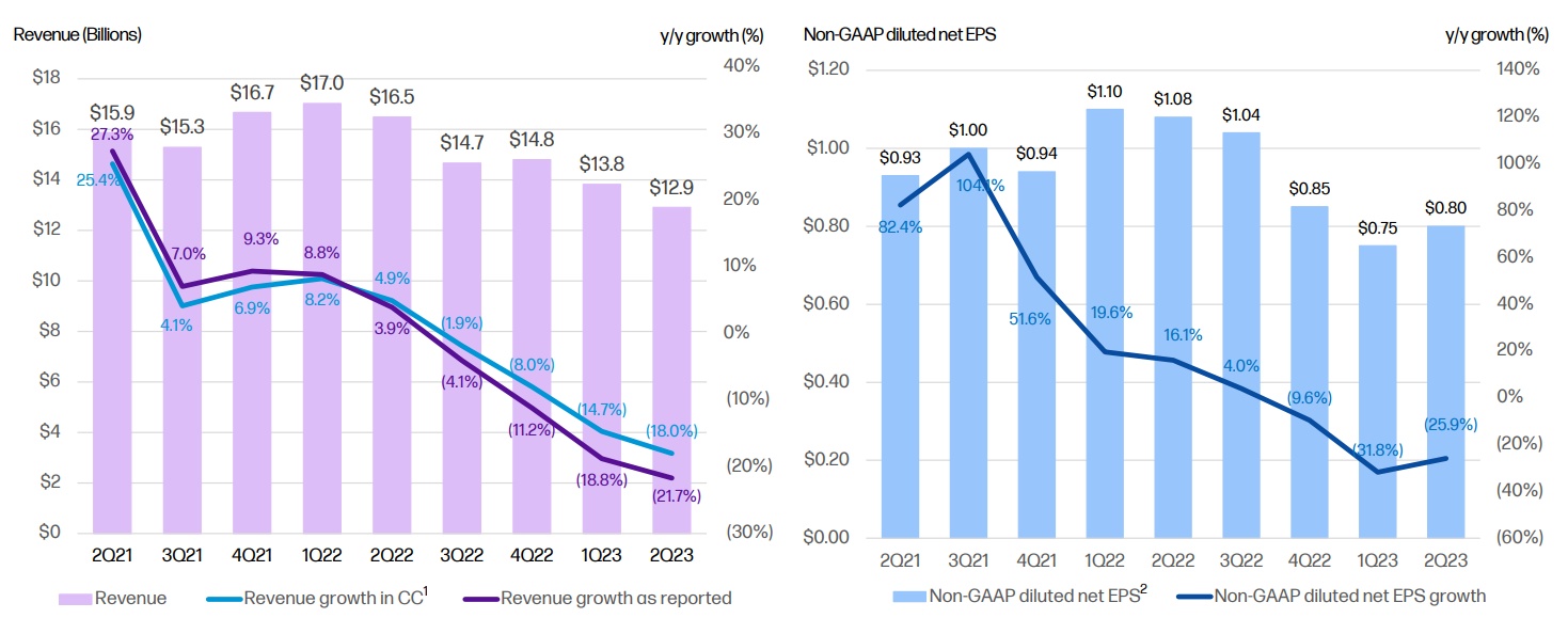 智通财经APP获悉,PC巨头惠普(HPQ.US)公布的营收下滑幅度超过分析师预期,显示该公司继续受到个人电脑需求持续低迷的拖累。该公司周二美股盘后公布的业绩数据显示,截至4月30日的2023财年第二季度,该公司总营收同比下降22%,至129亿美元,略低于分析师普遍预期的130亿美元。