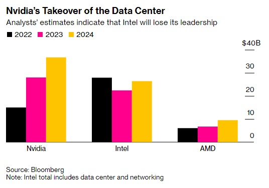 如今,在数据中心销售额方面,英伟达已经势不可挡地超过英特尔——这在几年前还是一个难以想象的壮举。