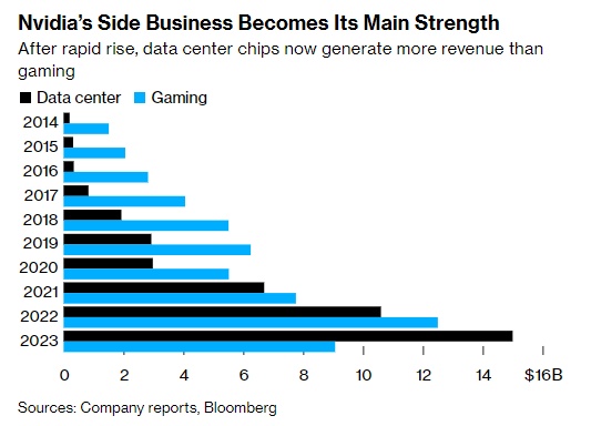 人工智能的需求也让英伟达的数据中心业务从一个次要环节变成了其主要吸引力。这帮助该公司度过了游戏业务放缓的难关,该业务受到电脑销售普遍下滑的影响。