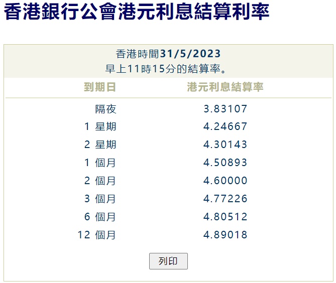 智通财经APP获悉,5月31日,港元长期拆息续升,但两周及以下利率全线下跌,其中,隔夜息再跌穿4厘,低见3.83107厘,一周钱跌至4.24667厘,而与楼按相关的一个月拆息则升至4.50893厘,连升四日。反映银行资金成本的三个月拆息报4.77226厘,创逾一周新高。六个月及一年期分别升至4.80512及4.89018厘。