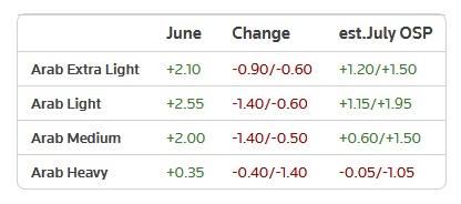 7名受访者表示,沙特阿美可能会在7月将其旗舰阿拉伯轻质原油的官方售价下调约1美元/桶。这将使阿拉伯轻质原油的价格较区域基准阿曼/迪拜原油升水约1.55美元/桶,为2021年11月以来的最低水平。
