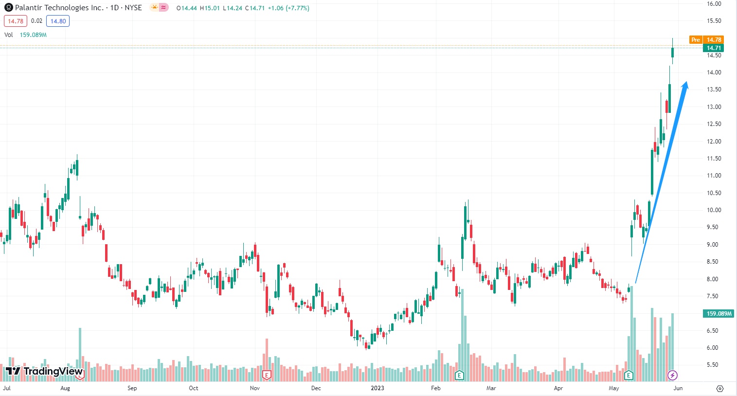 在人工智能军备竞赛的阵痛中,Palantir正在从沉睡的状态中崛起,其股票在过去几周一直处于火热状态。在充满希望的2023年前景、AIP的发布以及进一步的发展之间,Palantir的股票或许将会进一步追上人工智能热潮带来的涨势。