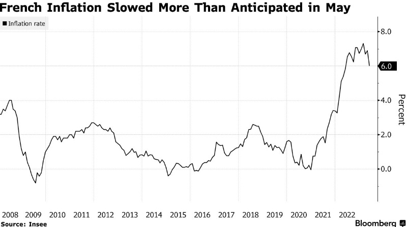 智通财经APP获悉,法国国家统计局周三公布的数据显示,法国5月消费者价格指数(CPI)同比增长6%,为一年来的最低增幅,低于4月的6.9%,也低于市场预期的6.4%。这一结果反映出各个行业(尤其是能源行业)的价格涨幅有所放缓。欧洲央行官员密切关注的制成品和服务通胀也分别降至4.1%和3%。