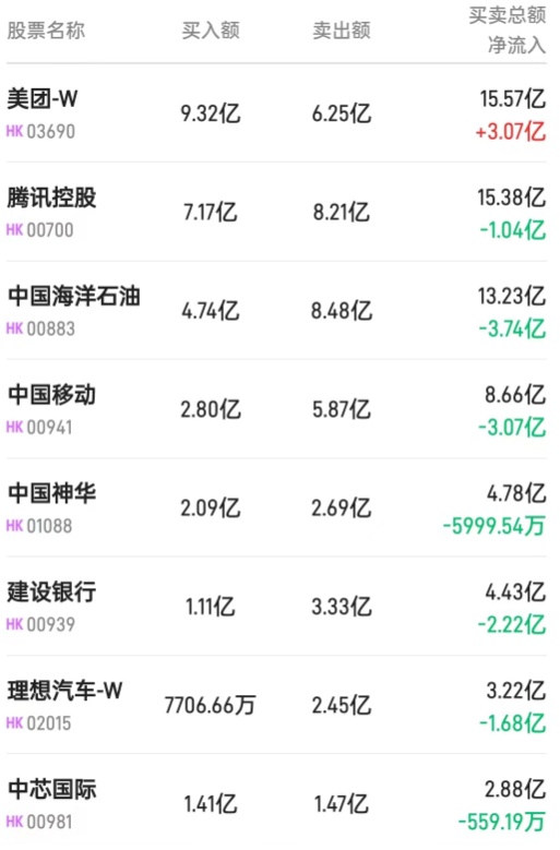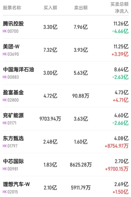 此外,盈富基金(02800)获净买入4.71亿港元。而腾讯(00700)、中国移动(00941)、理想汽车-W(02015)分别遭净卖出5.69亿、3.07亿、1780万港元。