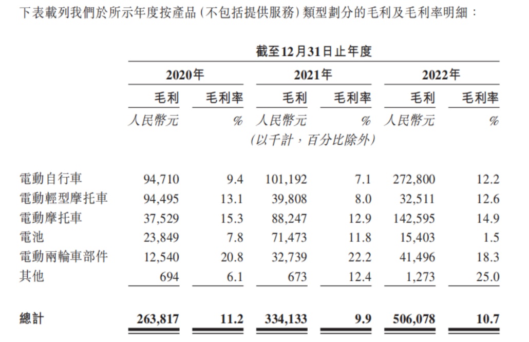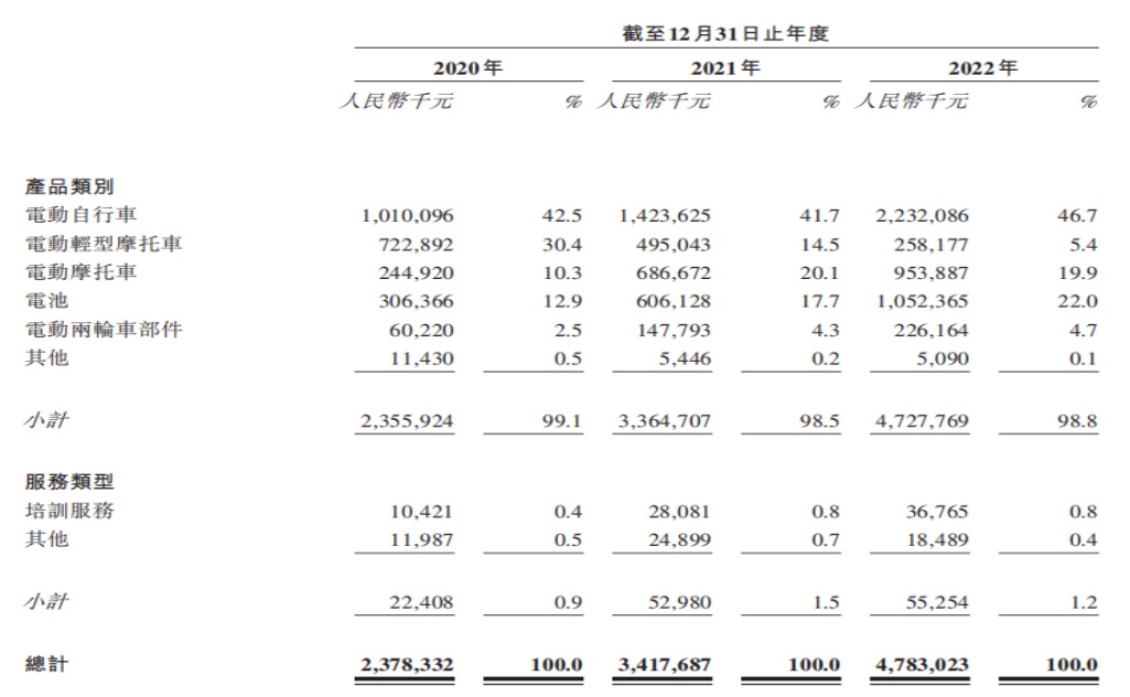 财务方面,公司收益主要来自电动两轮车的销售,而电动两轮车大致分为电动摩托车、电动轻便摩托车及电动自行车。其次,公司还从出售其他特殊功能车辆、电池及其他车辆部件以及向经销商提供各种服务产生收益。2022年,公司电动自行车、电动轻型摩托车以及电动摩托车收益分别为22.32亿元(人民币,下同)、2.58亿元、9.54亿元,分别占总收益46.7%、5.4%、19.9%。