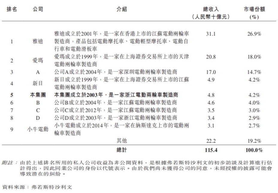 招股书显示,于2020年、2021年及2022年,公司收益分别是23.78亿元、34.18亿元及47.83亿元;同期净利润分别为4028.1万元、5926万元及1.18亿元。按收入计,2022年,绿源集团的市场份额为4.2%,排名第五,较排名前三的企业有明显差距。排名前九位的其他竞争对手的份额在2.7%至4.2%之间,可见绿源在规模上尚未与同级别竞争对手拉开明显差距。