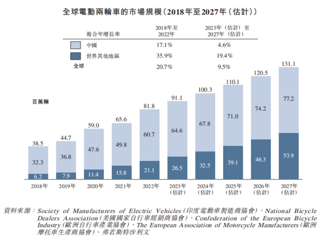 电动两轮车的全球总销量由2018年的3,850万辆增长至2022年的7,400万辆,复合年增长率为20.7%。未来,预计全球主要经济体将推出更严格的减排政策,以推动绿色出行的广泛普及和提高传统摩托车的替代率。因此,根据弗若斯特沙利文的资料,预期电动两轮车的全球总销量将于2027年达到1.31亿辆,2023年至2027年的复合年增长率为9.5%。