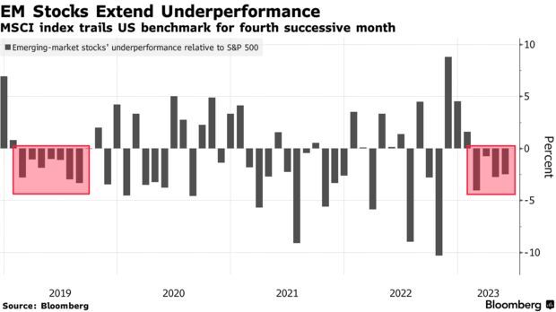 尽管拉丁美洲股市和半导体类股出现了强劲反弹,但由于经济增长风险以及地缘政治局势的不确定性,整体新兴市场的表现落后。在新兴市场基准指数的11个行业分类中,有10个行业在5月份出现下跌,其中房地产和大宗商品类股的跌幅最大。