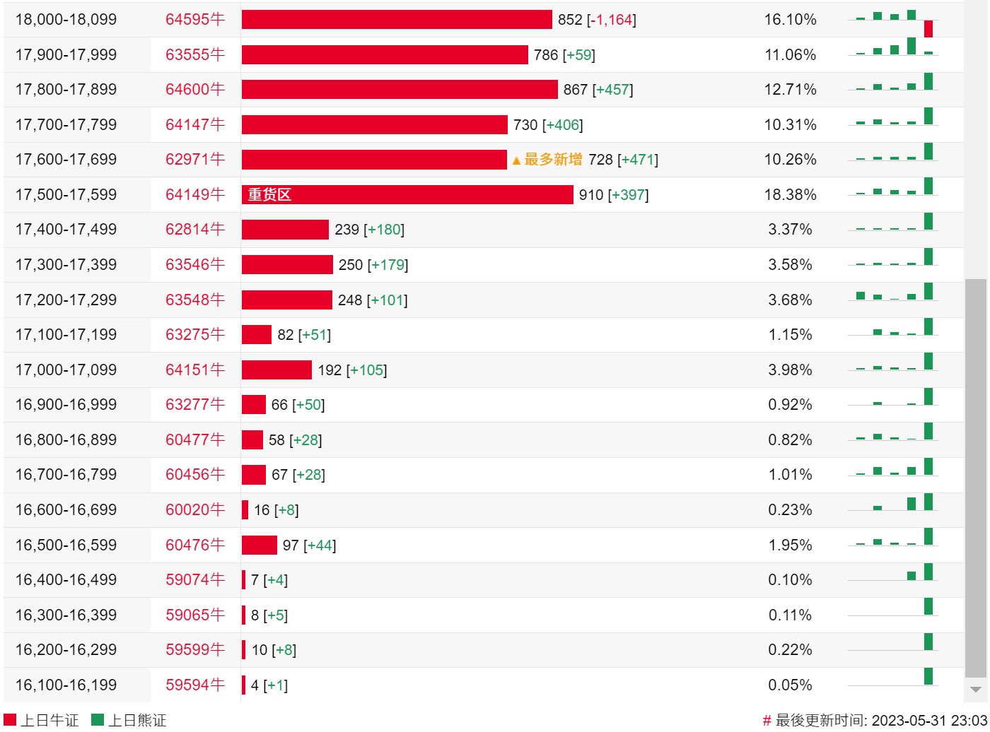 牛证街货重货区在17500-17599区间,该区间最新牛证数量为910张,较上一交易日增加397张;最多新增在17600-17699区间,该区间最新牛证数量为728张,较上一交易日增加471张。