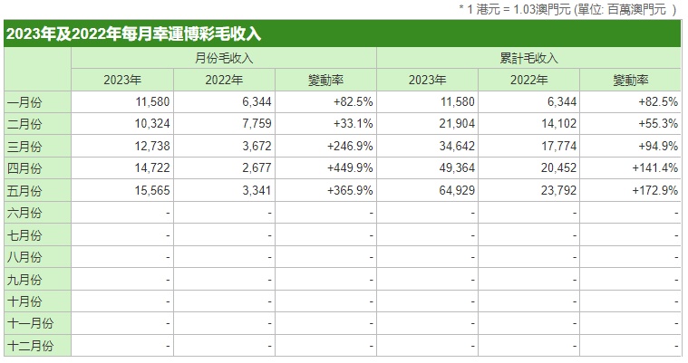 智通财经APP获悉,6月1日,澳门博彩监察协调局发布5月份博彩收入数据。数据显示,澳门5月份幸运博彩毛收入155.65亿澳门元,同比上升365.9%。澳门1-5月份幸运博彩累计毛收入649.29亿澳门元,同比上升172.9%。