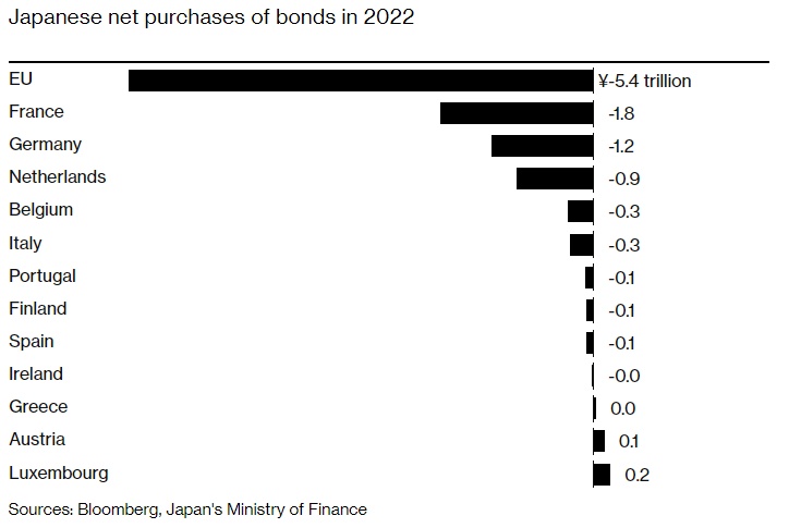 据数据显示,日本投资者在2022年抛售了5.4万亿日元(387亿美元)的欧洲债券,这是自2005年以来最多的。尽管今年迄今为止日本基金一直是净买家,但它们的购买额仅为810亿日元,为六年来第一季度的最低水平。