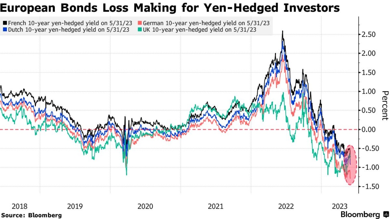 然而,问题在于,对于那些希望对冲日元波动风险的投资者来说,欧洲最受日本投资者欢迎的债券市场已经开始亏损。对日元对冲的投资者来说,基准10年期法国债券的收益率约为-0.7%,而同等国债的收益率为- 1.3%。
