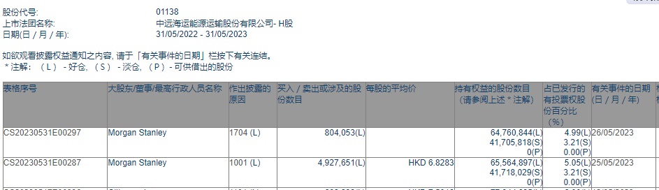 智通财经APP获悉,香港联交所最新资料显示,5月25日,大摩增持中远海能(01138)492.7651万股,每股作价6.8283港元,总金额约为3364.75万港元。增持后最新持股数目约为6556.49万股,最新持股比例为5.05%。