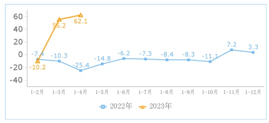 图4 2023年1-4月份分地区互联网业务收入增长情况