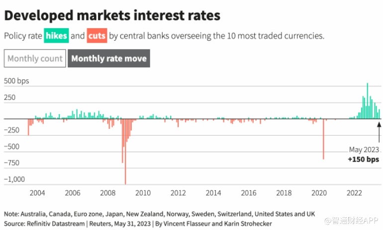 今年以来,10国集团央行已经加息21次,总共加息725个基点。相比之下,2022年全年加息54次,总共加息2700个基点。