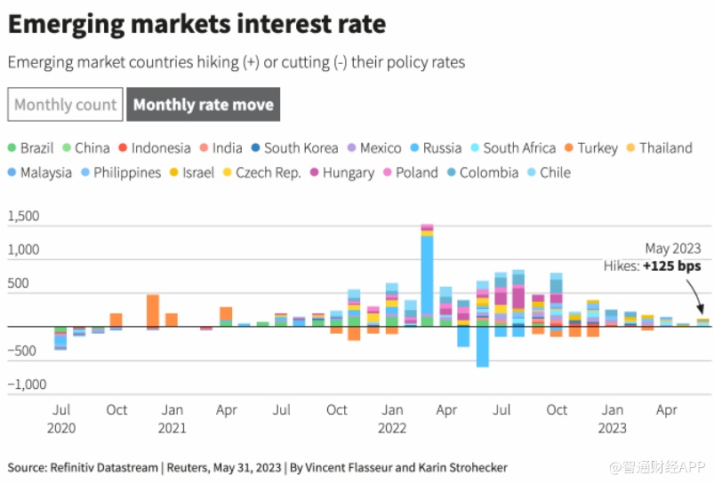 在媒体调查的18家发展中经济体央行中,有15家央行召开利率决议,但只有以色列、南非、泰国和马来西亚央行加息,且总共加息125个基点。相比之下,4月份有11次会议,两家央行总共加息50个基点。