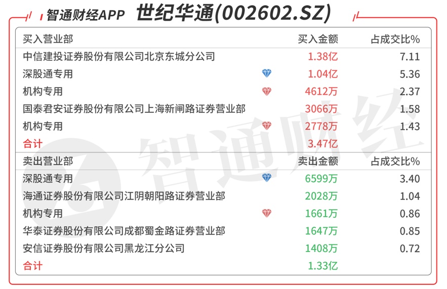 世纪华通(002602.SZ):受到众多机构青睐,今日共3个机构席位出现在龙虎榜单上,对倒合计净买入5729万元,深股通大单对倒买入3806万元,买四是知名游资的席位买入3008万元,当日净买入2.19亿元,该股今日突破所有均线,注意近期高点附近的压力。