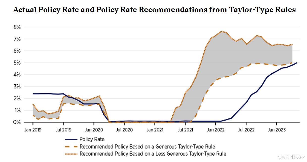他提供的图表显示,2022年时,实际的政策利率低于泰勒法则所建议的利率范围,这意味着当时的政策利率滞后于实际需求。但是,由于FOMC在2022年进行了大幅度的加息,并在今年仍在继续加息,所以目前的货币政策已经处于在当前宏观经济条件下具有足够限制性的范围内。