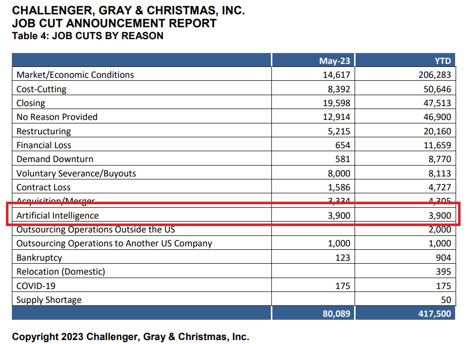 智通财经APP获悉,总体而言,截至5月份美国企业计划的裁员人数已经达到约417,500人,是去年同期计划裁员人数的四倍多。虽然编制这份报告的美国知名就业咨询公司——挑战者公司(Challenger, Gray & Christmas Inc.)长期以来一直专注于研究裁员背后的主要影响因素,但这似乎是该机构第一次将“人工智能”因素纳入其中,挑战者报告的数据显示上个月约有3900个工作岗位显然被众所周知的生成式AI机器人所夺走,AI带来的裁员潮也许才刚刚开始。