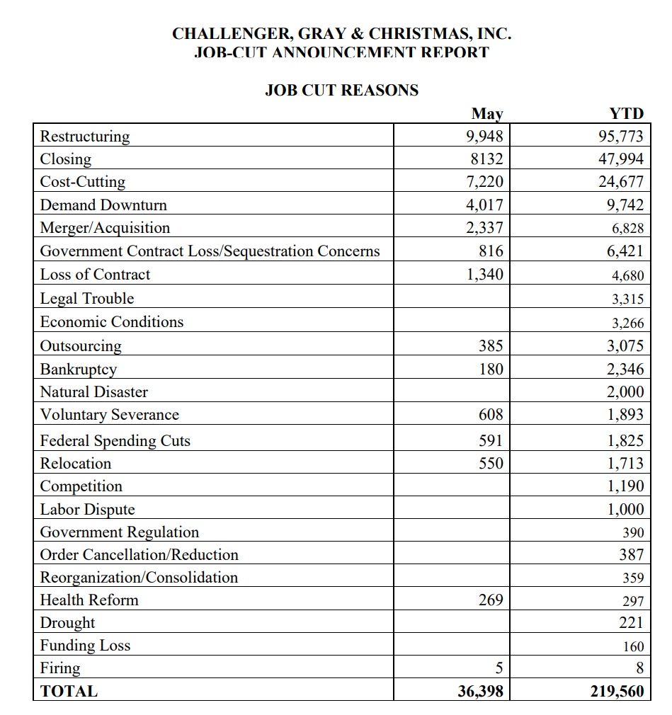 作为对比,我们可以看到十年前企业裁员的主要原因。回到2013年5月的这一“旧时代”,企业裁员的最主要的原因是简单的重组、企业关闭或企业削减成本。